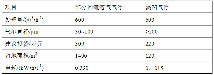 揚子石化含硫改建擴建工程竣工后,原污水場能力明顯不足,且原污水場界區內已無擴容場地,改造設施應小型化。改造方案在部分回流溶氣氣浮和渦凹氣浮中選擇,下表是2種方案的比較: