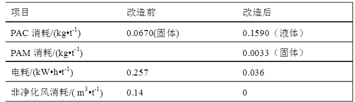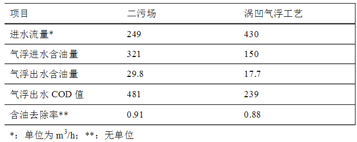投入使用的渦凹氣浮機組運行良好,設備振動及噪音很小;產生的氣泡均勻細密;出渣細密,分布均勻;出水清澈,無明顯油花。下表為改造前后生產運行數據對比: