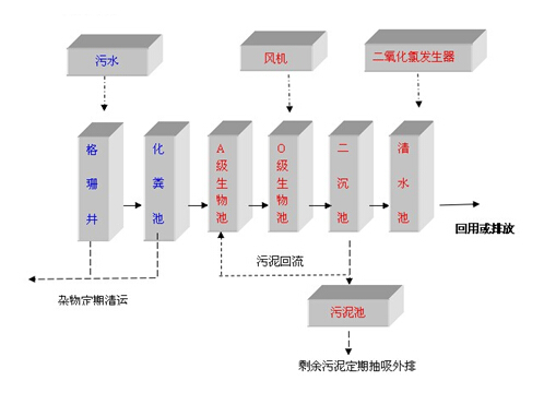 原污水→格柵→調節池→污泥吸附池→初沉池→三級接觸氧化池→二沉池→消毒池→排放