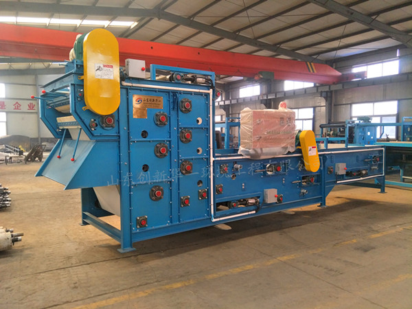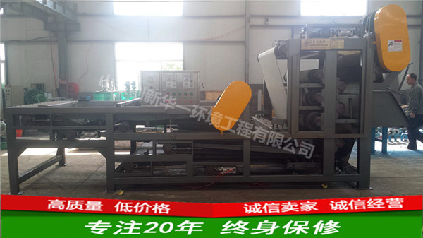 4、洗塑污泥脫水機的濃縮過程如下:污泥進入濃縮段時被均勻攤鋪在濾布上,好似一層薄薄的泥層,在重力作用下泥層中污泥的表面水大量分離并通過濾布空隙迅速排走,而污泥固體顆粒則被截留在濾布上。此時污泥中固體的截留率是很高的,隨著濾布的行走,進一步脫去一部分水分,并且相粘結形成流動性較差的漿狀污泥。由于污泥流動性差,進入后續壓濾機的高壓剪切段后不容易被擠出來,因此脫水效果得到保證,最終泥餅的含固率提高很明顯。