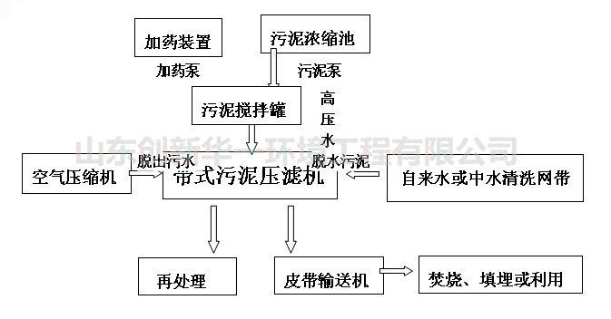 3、 污泥經加藥處理后先送至濃縮段,經過幾十秒種濃縮處理后污泥濃度達到2%-10%以上(視操作要求而定),然后經過污泥配料裝置送到壓濾脫水段,然后形成具有一定含固率的泥兒餅。